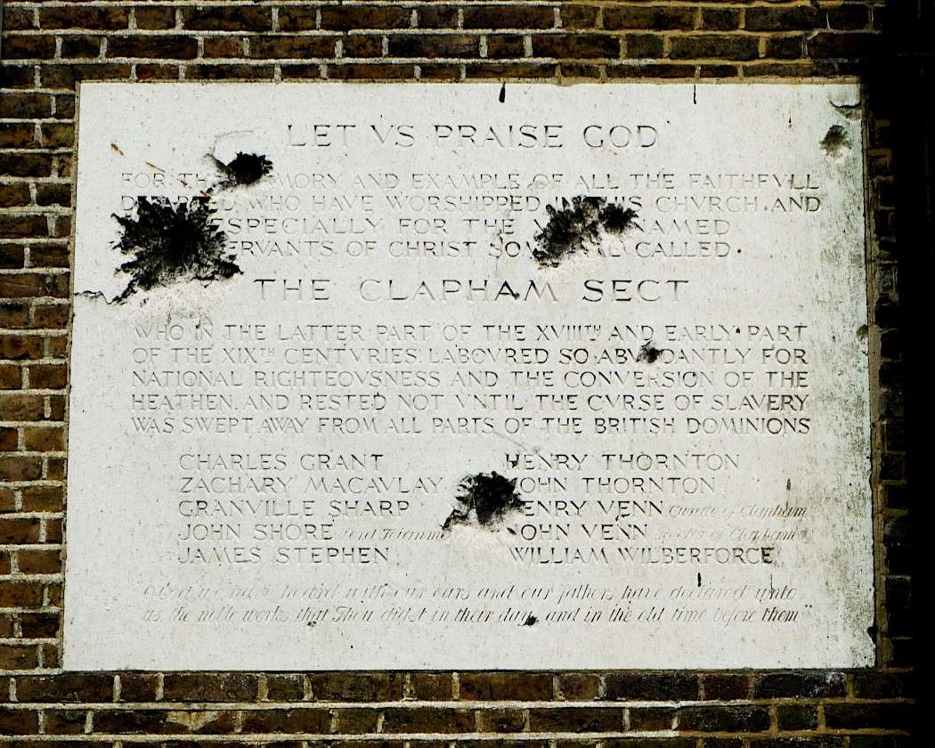 Let us praise God. for the memory and example of all the faithfull departed who have worshipped in this church and especially for the below named servants of Christ some have called 'The Clapham Sect' who in the latter part of the XVIIIth and early part of the XIXth centuries laboured so abundantly for national righteousness and the conversion of the heathen, and rested not until the curse of slavery was swept away from all parts of the British Dominions.